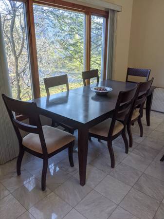 Sleek and contemporary dark wood dining table with 6 matching chairs.
