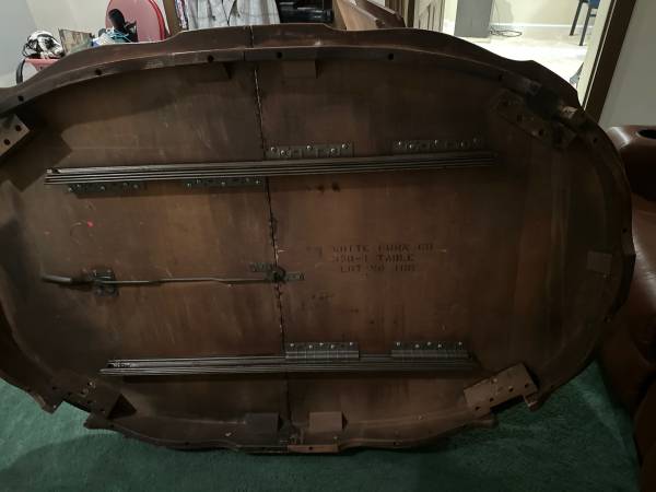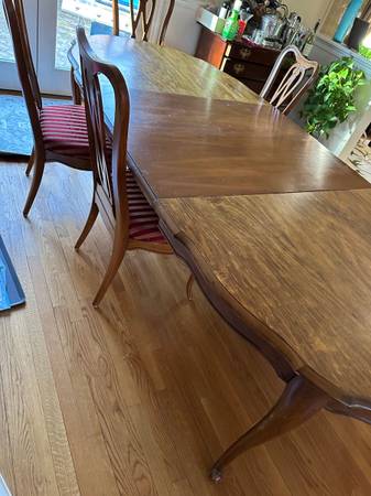 1960’s dinning-room table with 2 leaf to extend approx 103 inches. Heavy wood. Currently dissembled for easy transport. 6 chairs are spring seats. Table needs refinishing. However i just used a table cloth. Very solid table. One of the arms is off the end chair. No delivery. If its posted its available. Please contact thru email. First floor easy access. Check your spam folder sometimes responding end up there. Scamers dont bother.