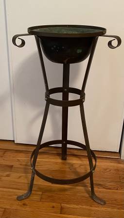 Vintage metal plant stand for sale. Comes with patinaed metal bowl for plant. Three legs. Excellent condition. 29” Tall. 11” diameter ring for plant bowl. $20 Cash only. Pick up only.