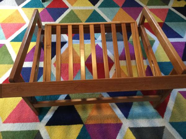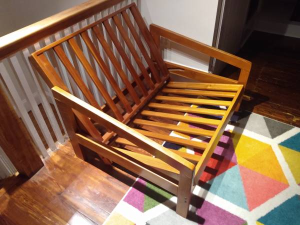 Solid wood futon frame in very good condition. The mechanism works perfectly to open and close to switch between flat (to use as a bed) and upright (to use as a couch / sofa). Clean, no big scratches, and only lightly used -- only a few minor nicks and scratches in the wood. Beautiful light color.