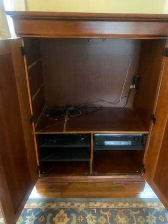 Solid wood cabinet for sale. Nice and well cared for. Fits a 42" flat screen, plus stereo equipment. Can also be used as a wardrobe or everyday storage.
