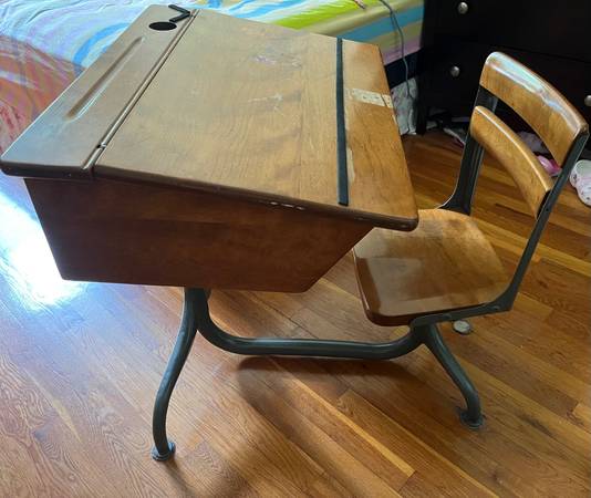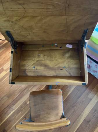 Vintage wood kids adjustable desk with flip top storage drawer & rotating chair. It’s used with a few scratches but in very good condition for $50.