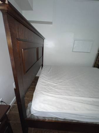 Queen size bed frame and head board/ Includes Queen size mattress, mattress cover and box spring. Must pick up. First Come First Serve. Good Condition.