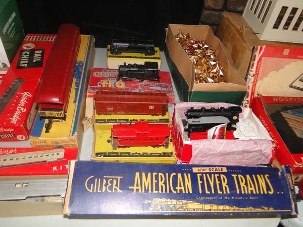 Items for sale include: Two Leather Chairs with Ottomans on the style of Stressless. Leather Sectional Sofa. White Leather Sofa/Loveseat/Chair. Antique Bedroom Set. Kitchenware. Tools. American Flyer Trains/other Trains and Plasticville. Christmas. Glass Top Dining Room/Kitchen Table with chairs. Counter height Chairs. Folding Shelf. Oriental Server Cabinet. Vintage Cameras. 45 Records. CDs. Books. Office Supplies. Bamboo Shelf. Misc. Small Furniture Pieces. Plane Models. Evinrude Motor. +++PricedToSell.