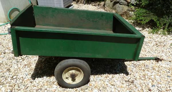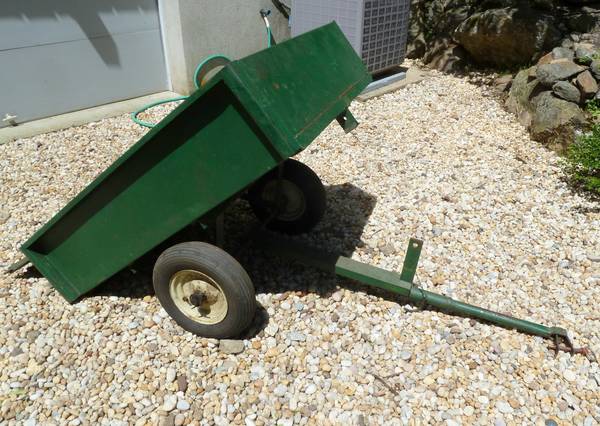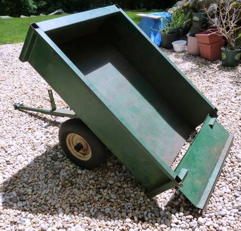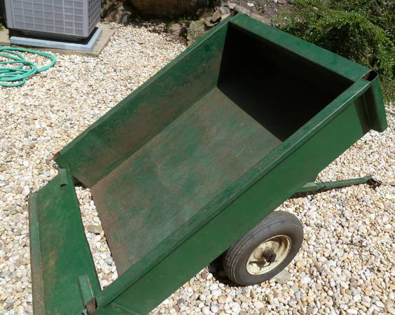 This is a 1960's garden dump cart in very good, unrusted condition. It weighs over twice what a new model would be and is very solid. It is: 48"x36"x12".