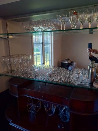 BEVELED MIRROR FOR SALE 54 L 48H USED AS BACK OF BAR 2 GLASS SHELVES FOR SALE ALSO 57 L 8 W GLASS IS 3/8 INCH THICK 2 SHELVING TRACKS 48 INCHES LONG 4 SHELVING BRACKETS 8 INCHES