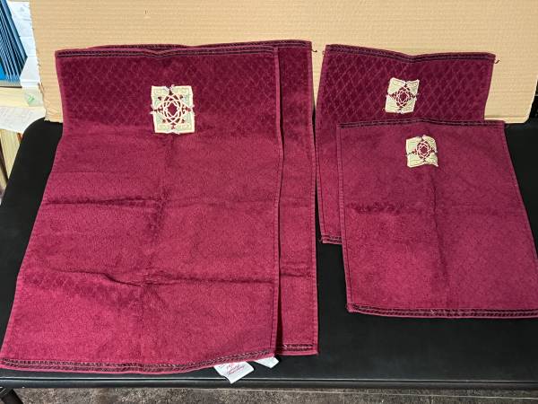 1. I have a set of 2 hand towels (23"L x 15"W) & 2 wash cloths (15"L x 11.5"W) never used. 100% cotton. Machine washable. Asking $10