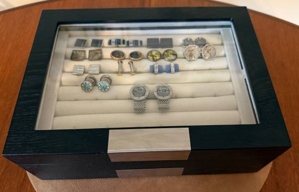 Measuring 11” wide x 8” deep x 4” high, it’s compact yet elegant. To make it extra special, a 13 pairs of cufflinks are included, adding timeless character and ready-to-give appeal.