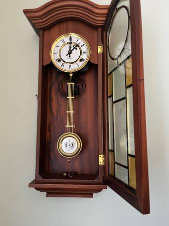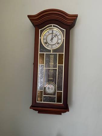 Selling in excellent working condition a chiming pendulum wall clock in real wood and stain glass. Comes with key. In excellent condition. From pet/smoke free home. 5 inches deep by 20 inches Height...