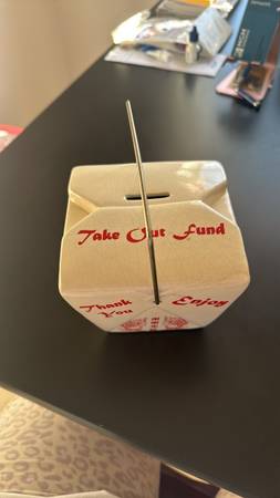 Ceramic Chinese takeout. It’s a bank. Has crackling look in the ceramic. Very cute.