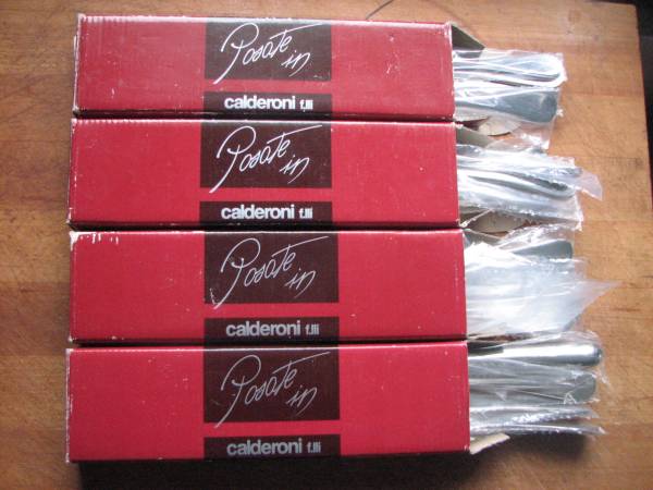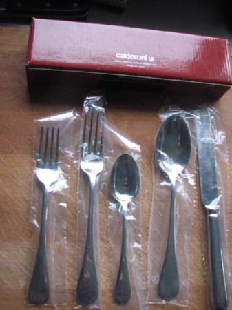 $500 (firm) price per box (each box contains a 5 piece place setting in individual plastic.) High quality 18/10 stainless steel flatware made in Italy. Classic simple elegant modern design with a glossy finish. Boxes have some wear and tear from storage and moving them around.