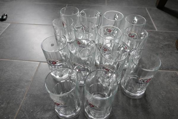 Each mug/stein holds 1/2 liter capacity, is 6" high with a 3 3/8" mouth. Made in Germany (on sticker.) All 12 for $160 but will sell lower quantities prorated.