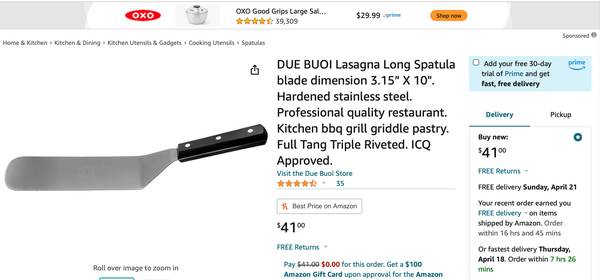 From Williams-Sonoma (no long available from WS) Made in Italy of stainless steel. One left. No low ball offers, please. Known as a lasagna spatula and also perfect for cheese steaks, chopped cheese; flip foods like a short order cook. Could also be used for pastry frosting, icing tall or large sheet cakes, serving pizza slices or flipping crepes.