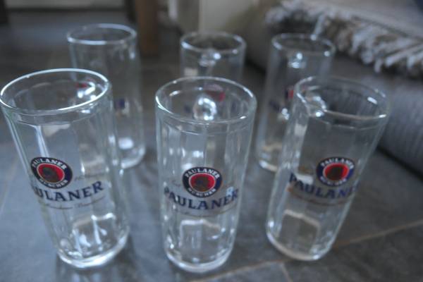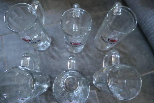Each mug/stein holds 1/2 liter capacity, is 7" high with a 3" mouth. Made in Germany (on sticker.) All 6 for $70. Can also be used to for ice cream floats, milk shakes, iced teas/coffees, bubble teas or any type of drink including hot ones like hot chocolate as the glass is thick.