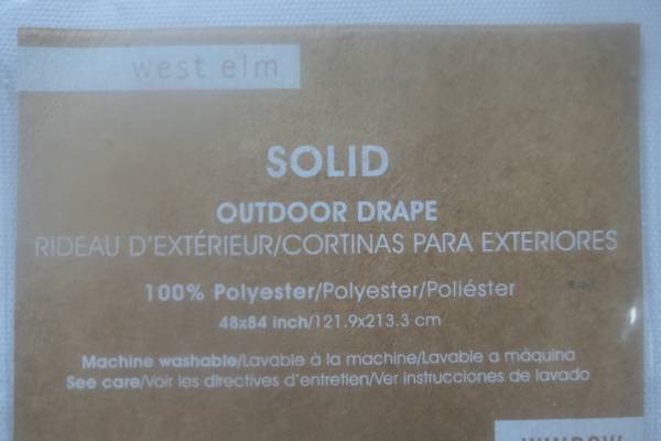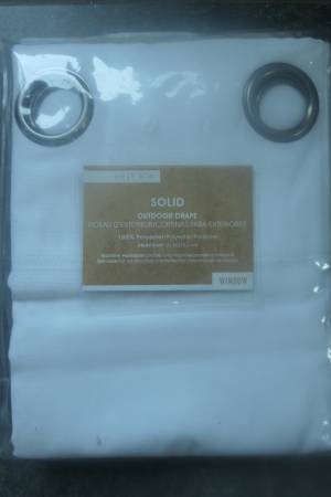 48"w x 84" h. 100% polyester so is very sturdy. White color. Could also be used indoors. Has grommets that make it easier to slide across a curtain rod much easier.