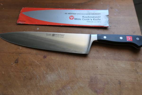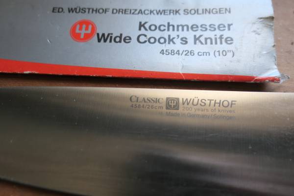 This is the thicker and heavier blade version (SKU # 4584) that cuts easily into bunches of carrots, whole pumpkins, chickens, lobsters, crabs...etc. Used twice to cut into whole watermelons so in excellent condition and factory razor sharp.