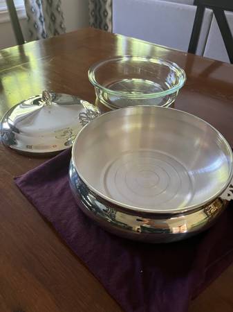 This three-quart silver-plated covered casserole dish features handles with an intricate design, along with a cheerful pineapple on top of the lid. The dish includes a glass liner for easy cleanup.