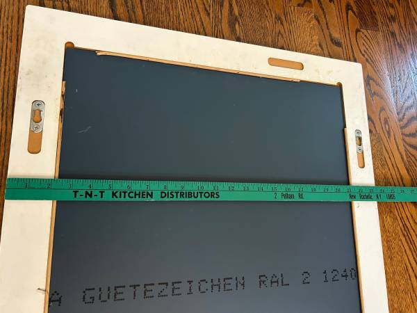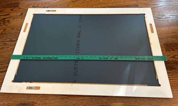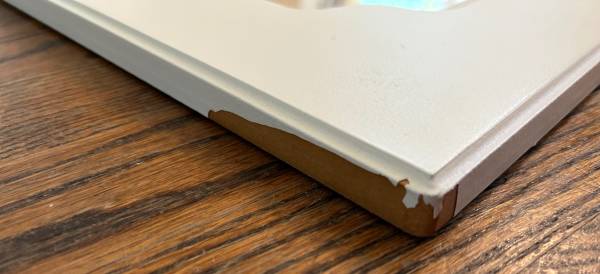 23.5” by 35”. Frame has imperfections but mirror is fine. White Chipped paint in one corner- see photos