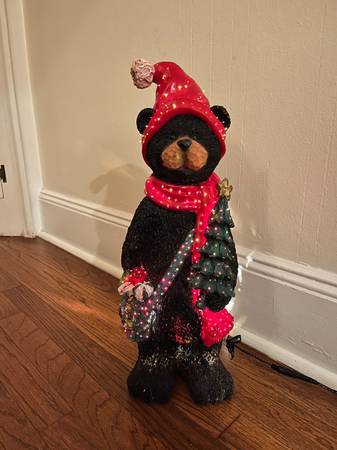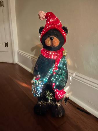 30” tall adorable carved wood look fiber optic Christmas Bear. Bear is wearing stocking hat, blue striped scarf, has a sack with gifts slung over one shoulder and is carrying a small decorated tree.