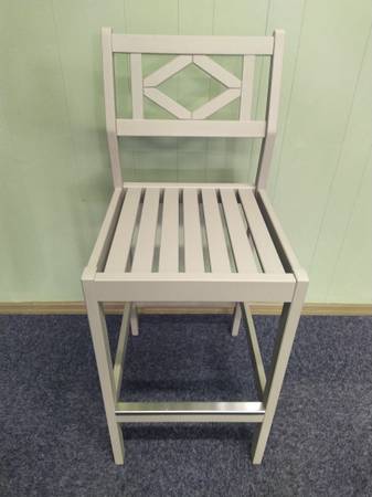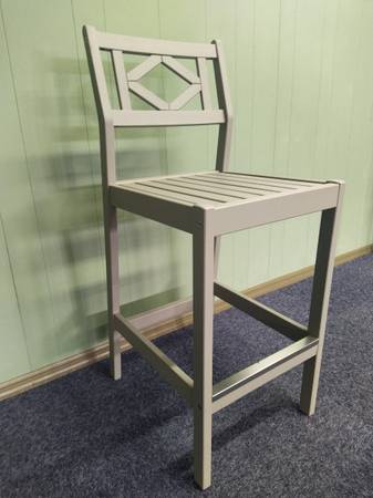 Solid Ikea Bondholmen bar stools with back rest. We have six available - one on display, the remaining five NEW and still in unopened box. $50 each or $45 for two-four or $240 each for all six. Made of high quality, sustainably sourced eucalyptus wood, this sturdy and durable chair features a stylish gray finish. Measuring 24 3/8" in length, 24 3/4" in width, and 43 1/4" in height.