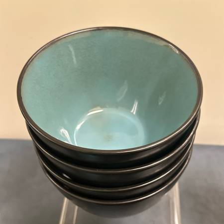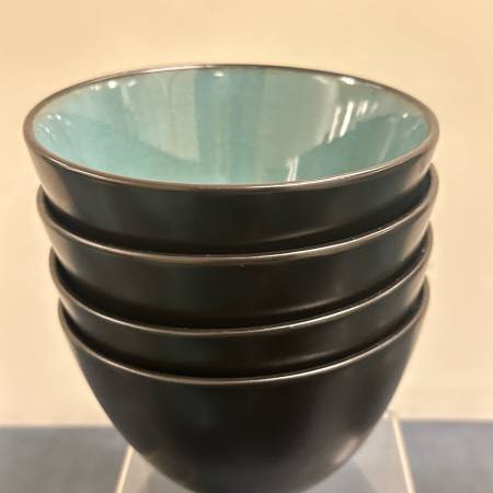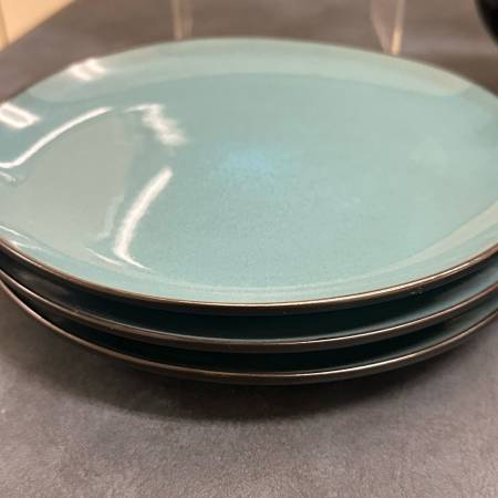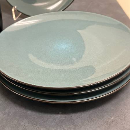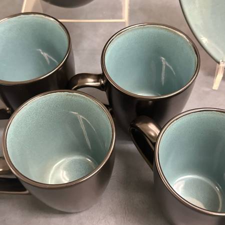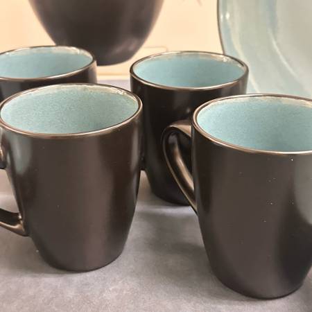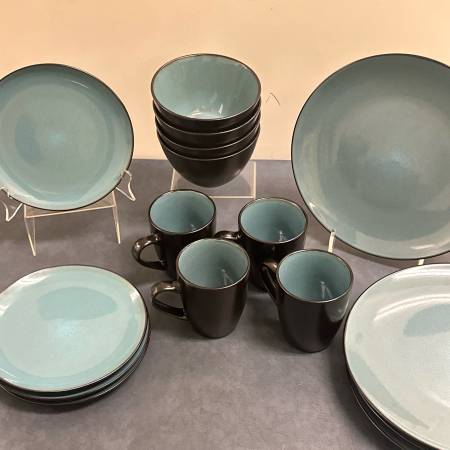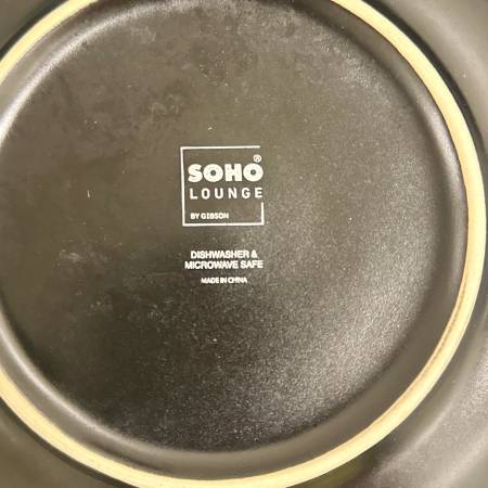 Gibson dinnerware set in greenish-blue color with black trim, including salad plates, dinner plates, deep bowls, and coffee mugs. Marked "SOHO Lounge by Gibson" on underside.