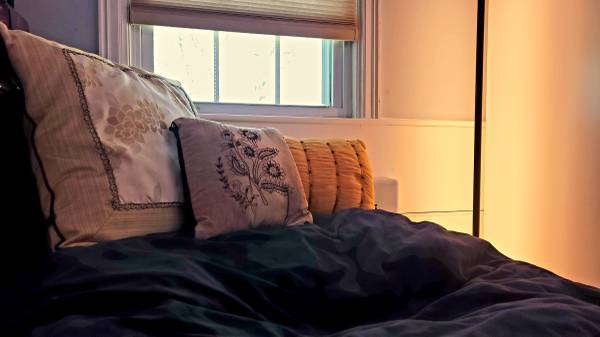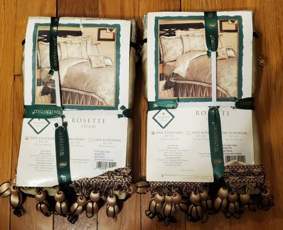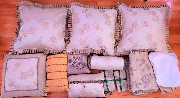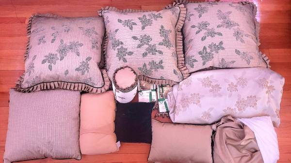 Enhance your bedroom with this king size bedroom decor. Comes with 3 large pillows, 5 smaller different sized ones, 2 unopened pillow shams, 1 king sized duvet cover, and 1 king bedskirt. The roll pillow had decor like the unopened shams, but were removed and look perfectly fine without them. 3 large pillows were steamed cleaned, the duvet cover was dry cleaned and the bedskirt was washed. All ready for next person. This set was mostly in the guestroom.