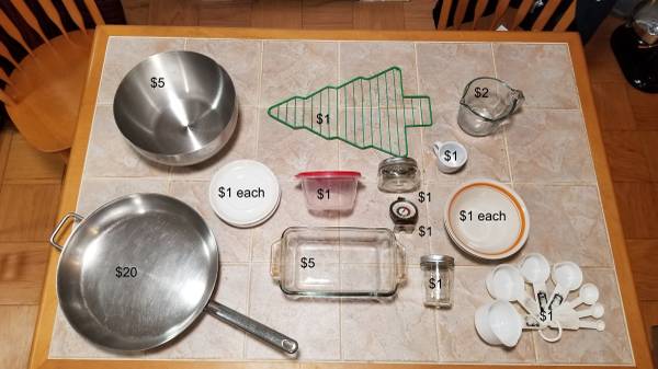 Small plates: $1/each (4 plates available) Bowls: $1/each (2 available) Cooling rack: $1 Espresso cup: $1 Square Ball Mason Jar: $1 Round Ball Mason Jar: $1 Rubbermaid Tupperware: $1 Oven...