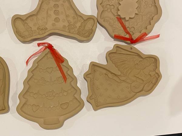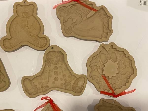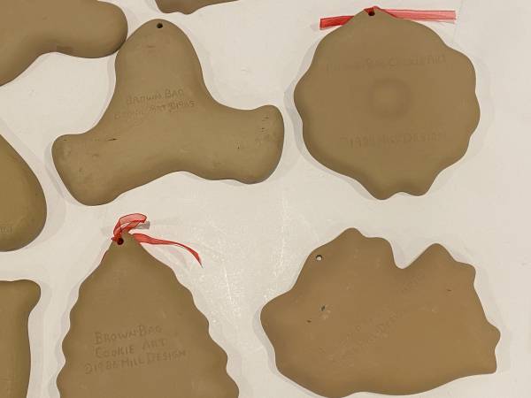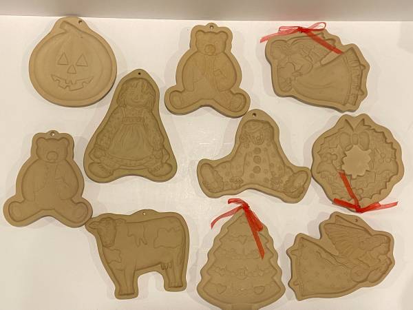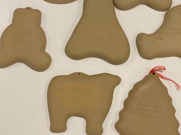 10 Vintage Brown Bag Cookie Art Molds Cutters Clown Bear Angel Tree 1. Clown 1985 2. Bear Holding Bear 1984 3. Cow 1986 4. Raggedy Ann 1985 5. Jack O’ Lantern Pumpkin 1992 6. Bear Holding Bear 1984...