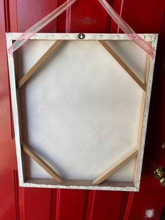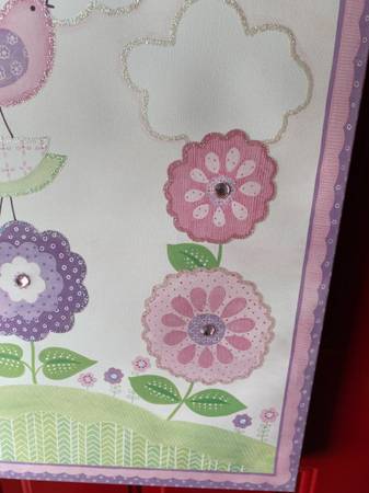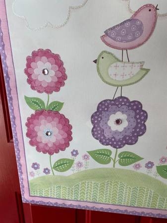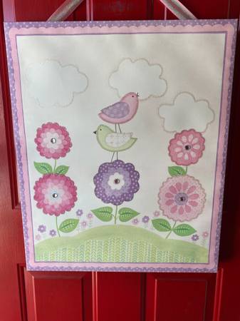 Excellent Condition Large Pink Green Purple Birds / Flowers Print Canvass 24” H x 20” W x 2.75” D Pink Hanging Ribbon Kid’s Child's Girl’s Playroom Bedroom Décor in Excellent Condition Art Work...