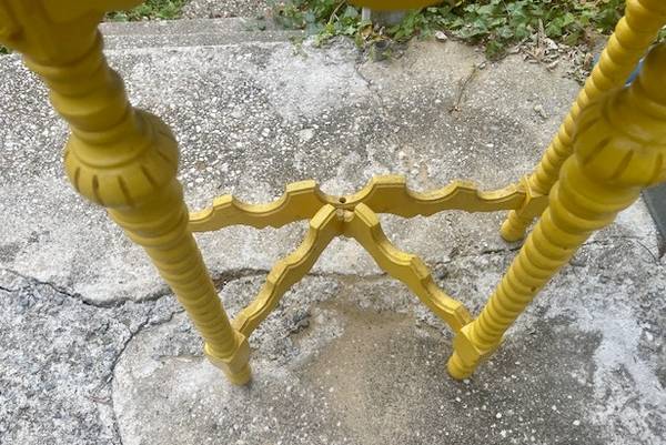 Table decorative, Yellow 'table demi lune vintage' 31" high, 26 1/4" wide at back, top is 12 7/8" Deep. Veneer on top is coming up ( could be taken off completely and painted) $45.00