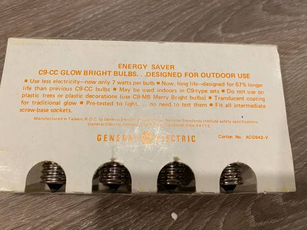 15 – 4 Packs of General Electric C9-CC Bulbs Blue, Green, Orange, Yellow Orange (sealed box – unable to test)