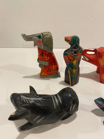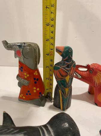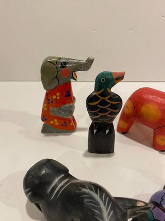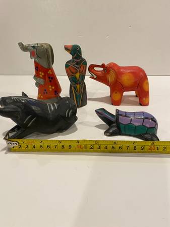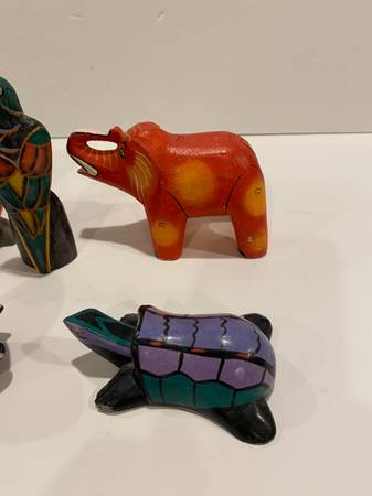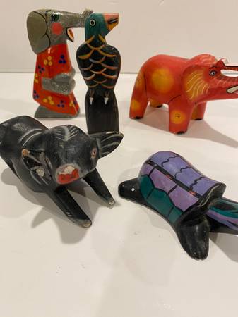 5 Vintage Folk Art Hand Carved Wooden Animals Elephants Bird Turtle Pig Trunks Up elephant pig has some chips