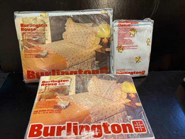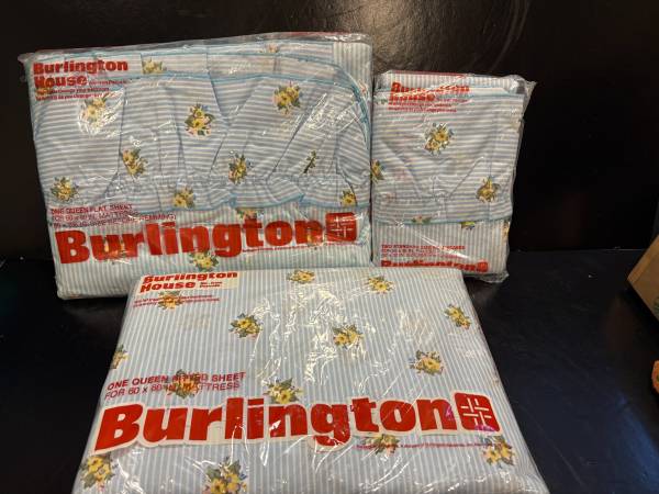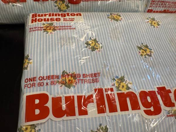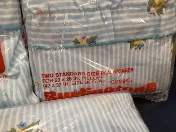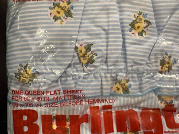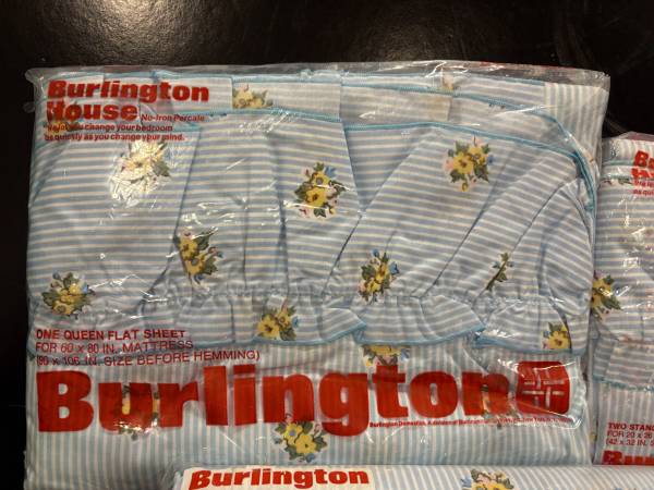 Vintage NEW NOS Burlington 4 pc Queen Size Blue Stripe with Yellow Flowers Sheet Set includes 1 – flat sheet, 1 – fitted sheet and 2 – standard pillow cases