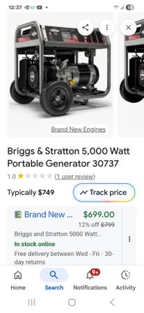 5000 wat Briggs & Straton Generator, Bought New Last year assembled filled with oil that came with it and put in gas pulled cord and started 1st pull Unused since 0 (Zero) hours Cost $700 + Tax