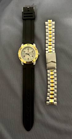Swiss Made Men’s VICTORINOX Stainless Steel Quartz Watch 39mm with gold PVD and silver dial with date. Excellent condition. Battery replaced along with new black silicone band. Working fine. Also included is the original stainless steel band with gold PVD.