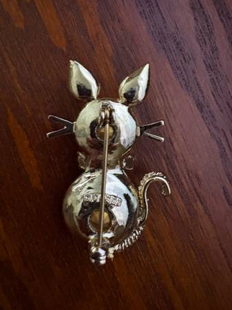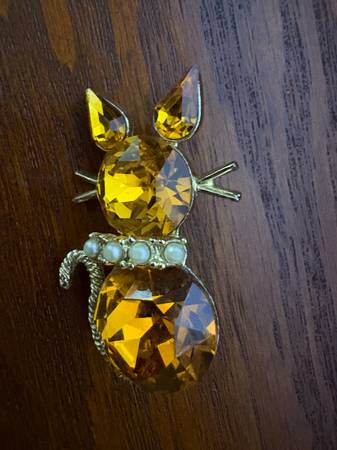 Vintage Signed Dodd Cat Brooch Pin Amber Clear Rhinestones and Faux Pearls 1 3/4” High