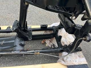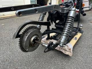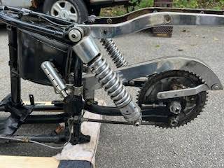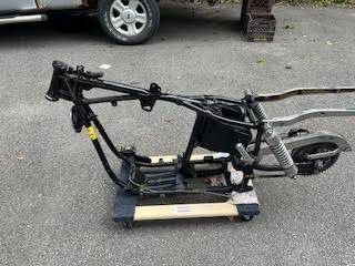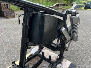 1963 dropseat frame with swingarm oil tank juice brakes and axle shocks and struts.