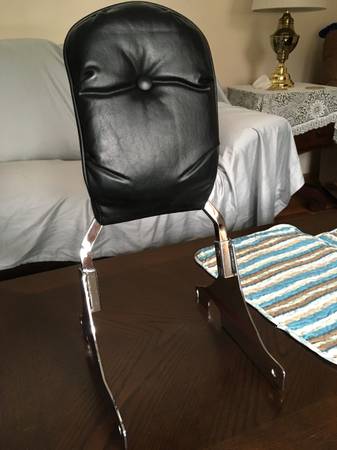 For Sale is a "fixed" padded sissy bar which came off an early 2000-ish Harley Sportster. It may also fit an early (2000's) Softail as it looks like it would fit on my 2001 Heritage Softail. The chrome and the pad are both in excellent condition.