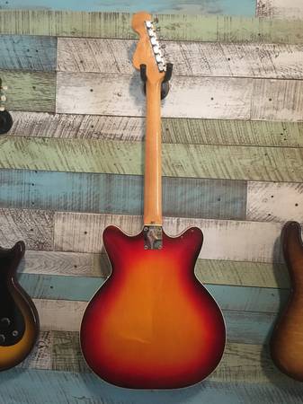 1966 Fender Coronado II vintage sunburst. First year for Fender under CBS. Checkerboard binding. Zero finish checking. Would be dead mint but for (a) a switched-out switch tip and (b) a small, weird bit of scarring on the back of the bass side horn. (It looks as though a previous owner spilled something on it that began to eat through the finish, but wiped it off before it did major damage. A few tiny holes down to the wood. See the photo.) OHSC.