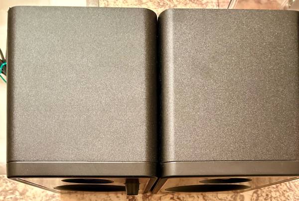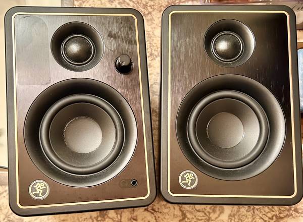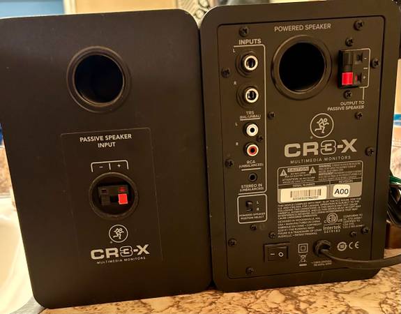 Mint condition powered speakers. Perfect for computers, gaming, or mixing music in a small space. 3 input options,1/4 inch phone jacks, RCA jacks, or 1/8 inch stereo jack. Attached power cord and cord to connect the passive speaker included. For small speakers these guys get loud. Cash only face to face transaction. Can deliver locally.