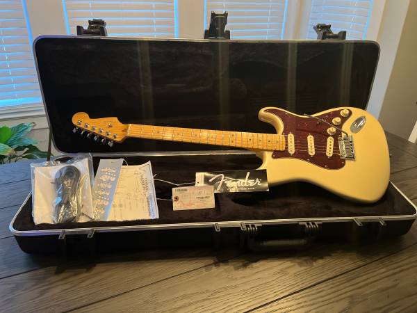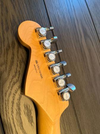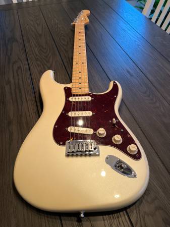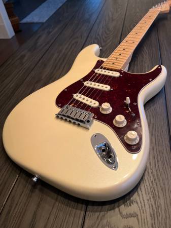 Beautiful playing stratocaster don't see to many Olympic Pearl used at smoke free Home..You won't be disappointed ...also case, hang tags and candy American Deluxe Stratocaster® guitar has all the modern features today's guitarists require. The compound radius fingerboard allows effortless string bending anywhere along the neck, and N3 Noiseless™ pickups provide improved Stratocaster tones for sparkling bell-like chime with no hum. Reconfigured S-1™ switching offers other distinctive tonal options; other features include staggered locking tuners, two-point synchronized American Deluxe tremolo bridge with pop-in arm, and beveled neck heel.
