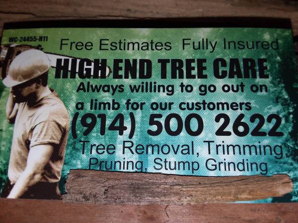 Tree removal Trimming stump grinding storm damage. Free estimates Fully insured. Based out of lower Westchester. Always willing to go out on a limb for our customers 914 500 2622