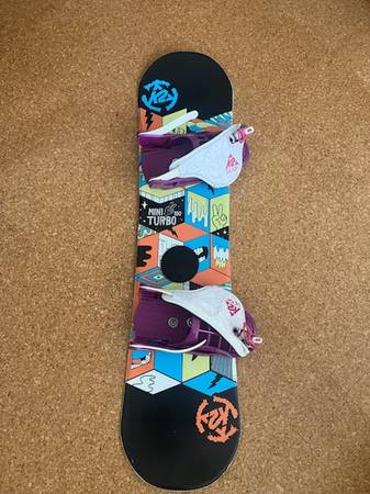 K2 Mini Turbo Snowboard with K2 bindings Good condition. Used a few times for 1 or 2 seasons. 100 centimeters
