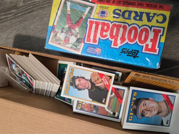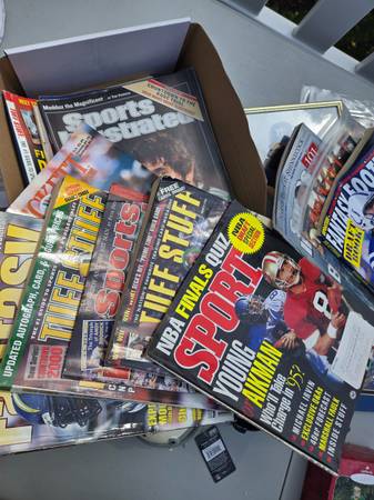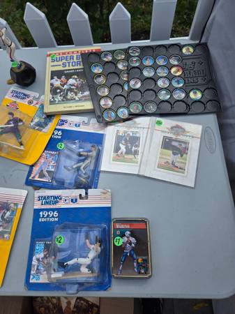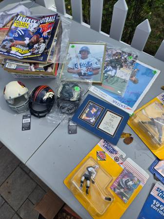 4 kenner starting kineup figures in box, jeff conine 8x10 autograph, Daryl Gardner 8x10 signature rookies auto. Greg Louganes paper print auto personalized 'to joe' , 3 mini helmets for decoration or useable in fish tanks, a whole stack of vintage magazines, beckett, sports illustrated, etc, dan marino quarterback club playing cards, complete set of 89 topps football sealed, container of 1988 topps baseball, partial set of topps coins, and everythong else you see in the pictures