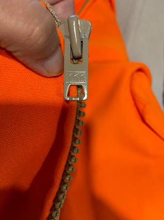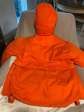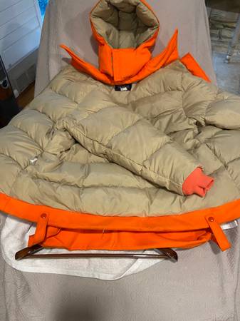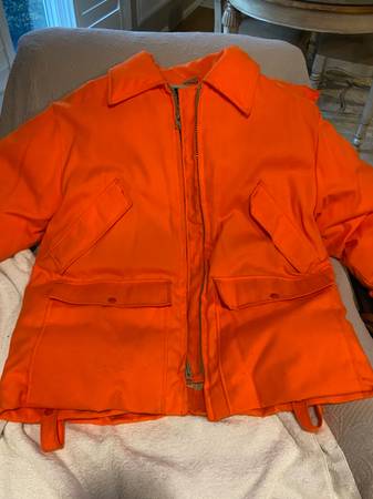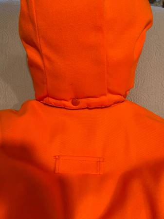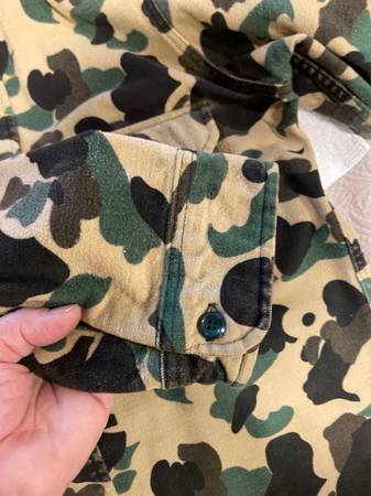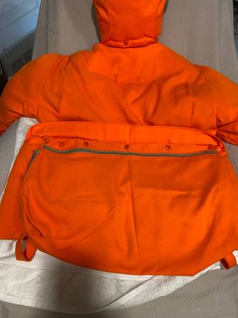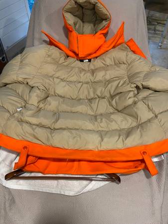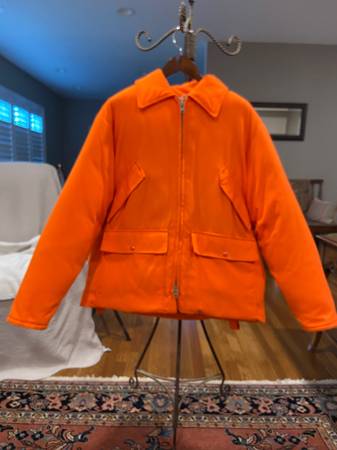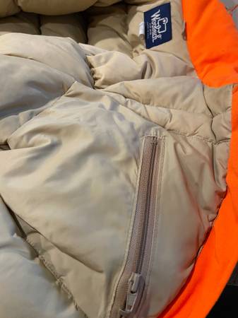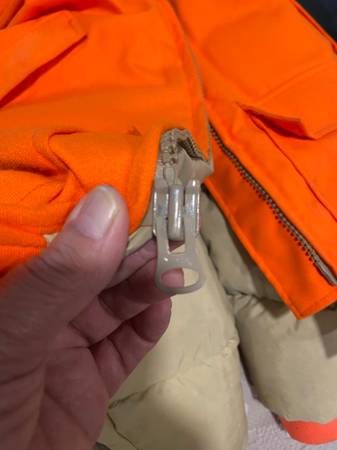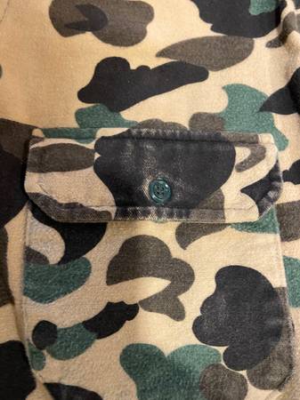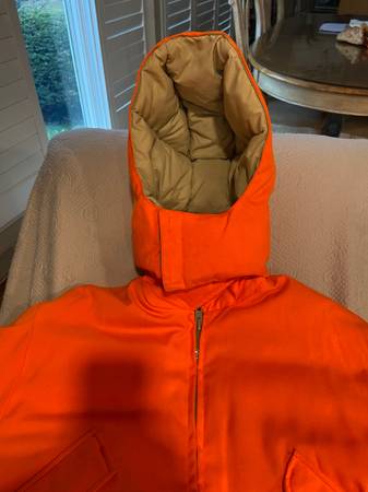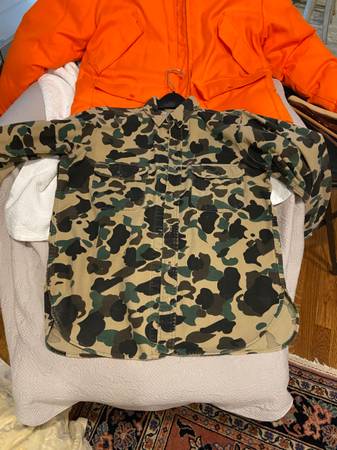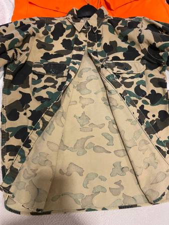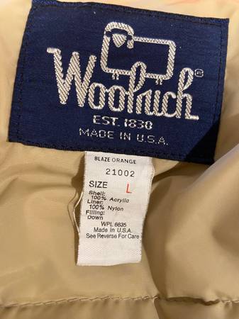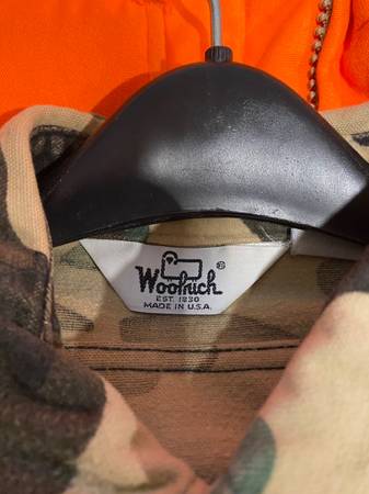 Has removable down hood and a removable bird bag in the rear of the coat. All zippers are YKK throughout. Large inside pocket and four strong deep pockets in the front, two of which snap. Sleeves have built in elastic wrist inserts to keep wind from entering from inside the sleeve while aiming. All snaps are very heavy duty possibly YKK too. Main front zipper zips from bottom to top with an additional zipper that allows you to unzip from the bottom up to get into your pant pocket without loosing heat. Included is a fleece Woolrich camo shirt in Large, also made in the USA. The shirt has two top pockets with buttons. This jacket was worn less than five times if that much, laundered and hung in my closet forever. Its the warmest coat I’ve owned, all you need is the fleece shirt the coat and you will be able survive in the Adirondack Mountains until you find your way out, (and that may take a while). Thanks for looking and good luck this season ! BTW the price is what it is for its condition. If looking for new gear like and kind, expect to pay 475 plus tax easily. Try it on, no worries should you decide otherwise.