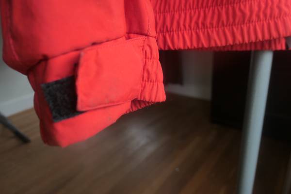 Bought from Tent and Trails near City Hall. Worn only a couple of times so in very good condition. Meant to keep one dry from wet conditions such as rainy days or on a kayak or boat it is wind and waterproof with velcro-closure sleeves and a drawstring neck. High visibility red color. Lightweight could be layered with a fleece jacket.