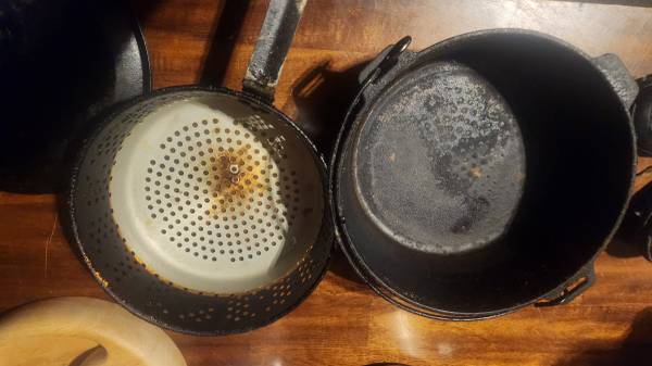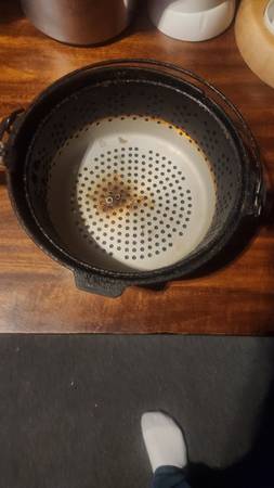 Includes a perforated pan and an iron pot and lid. Ideal for cooking enthusiasts, especially if you liked deep fried food. This basket if perfect for french fries, fried fish, and pieces of fried chicken. Every kitchen needs one of these. I can deliver, and you will never regret the purchase.