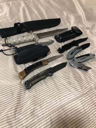 Knife collection Buck folding knife with case number 110 Emtek folding knife Two of them razor knife, folding with lock survival knife with case Gerber gut hook with case husky razor knife, folding...