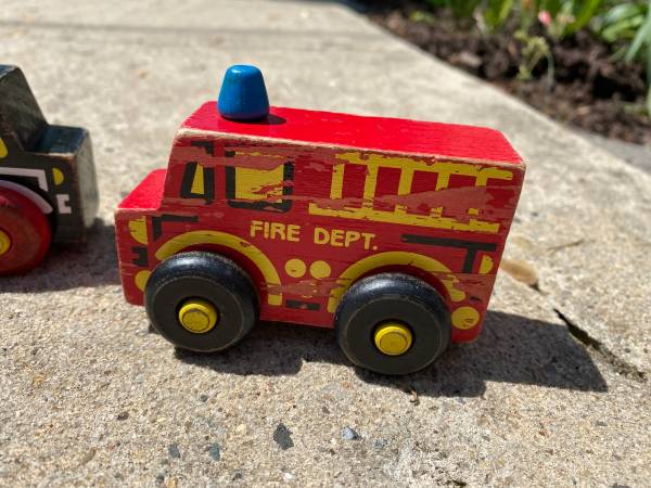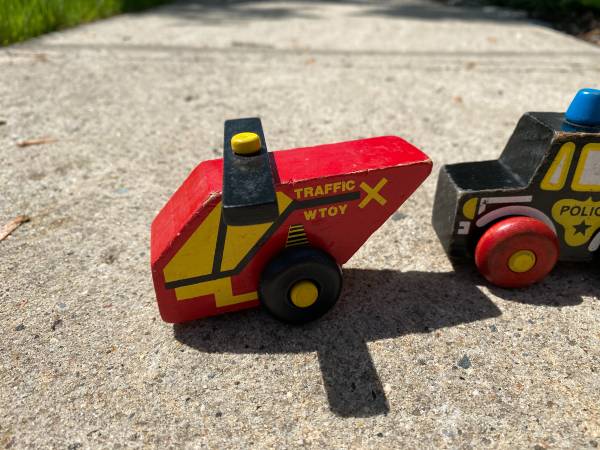 Vintage Wooden Toy Police Car Fire Truck and Helicopter Montgomery Schoolhouse
