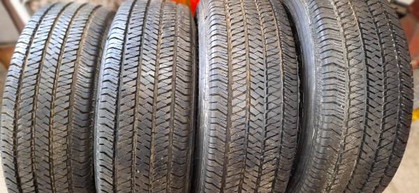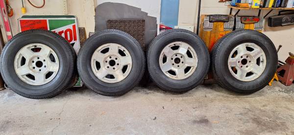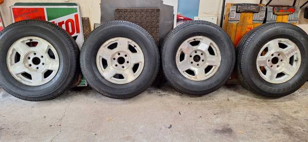 I HAVE (4) 265 70R17 BRIDGESTONE DUALER H/T TIRES MOUNTED ON 6 LUG GM WHEELS. SHOULD FIT NUMEROUS GM TRUCKS, PLEASE CHECK FOR YOUR APPLICATION. THEY WERE OFF A 2005 SUBURBAN. THEY WOULD MAKE GREAT WINTER TIRES AND WHEELS. THE RIMS ARE IN GOOD SHAPE HOWEVER CLEAR COAT IS STARTING TO PEEL AND AREN'T THAT PRETTY. SORRY NO CENTER CAPS $550.00 #2